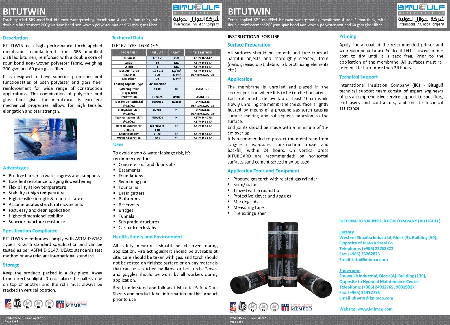 Bitutwin is a High Performance Torch Applied Membrane Manufactured SBS Modified Distilled Bitumen, reinforced with a Double Core of Spun Bond Non-Woven Polyester Fabric, Weighing 200 Gsm 60 Glass Fiber.